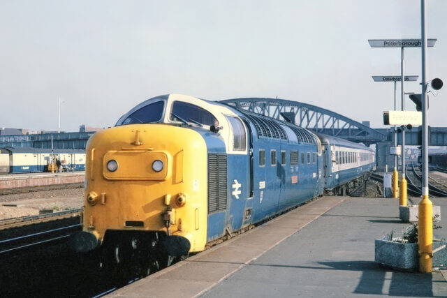 Class 55 Deltic #55018 “Ballymoss” arriving at Peterborough with a northbound service. Ballymoss served a mere 20 years on the East Coast Mainline, entering service in 1961 before hauling its last train in late 1981. In January 1982 it was cut up at Doncaster.