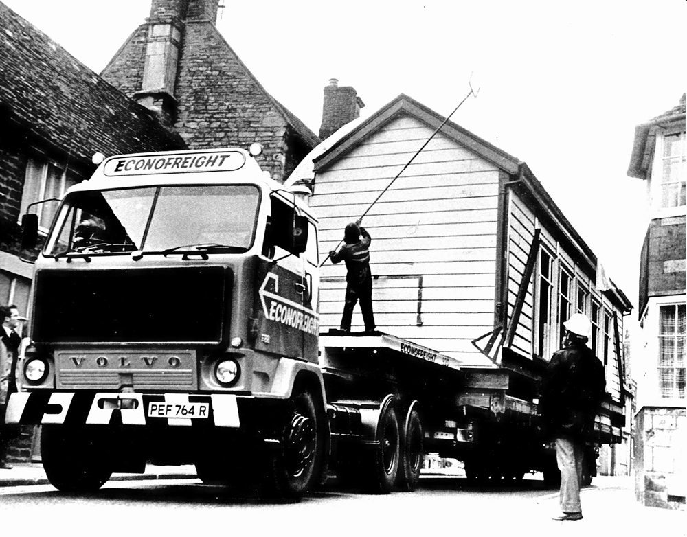 Amazing images showing the old station building from Barnwell being precariously manoeuvred in 1977 through the streets of Oundle on its way to the Nene Valley Railway headquarters at Stibbington where it is used today as the main platform waiting room.
