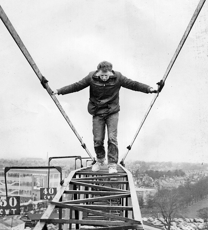 Crane operative Pete Wardle high above the old cattle market in February 1966.