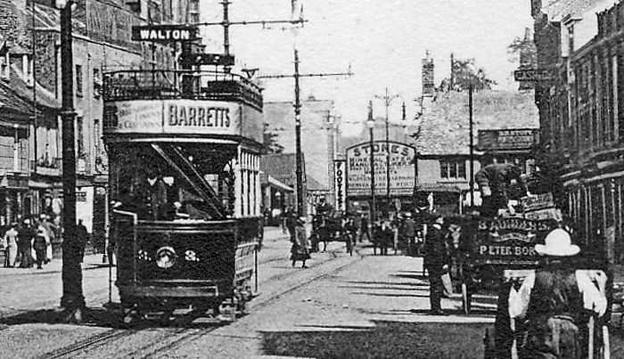 An undated but nicely detailed shot of Long Causeway as a Walton tram returns to the terminus.