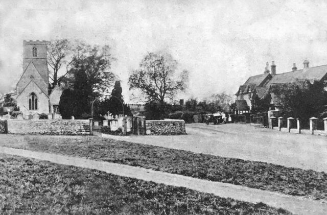 Stilton Church in 1912 and, opposite, a car is parked outside the old school which survives today as a private residence named “The Old School House”.