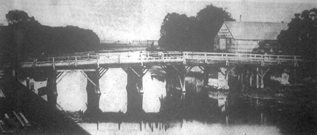 Home City Centre Town Bridge Town Bridge (1860s) City CentreTown Bridge Town Bridge (1860s) March 20, 2015 A very early image showing the original wooden Town Bridge captured in the 1860s by local painter/decorator Charles Colls. The view is looking towards the Embankment with T Hill’s Wharf in the background right.