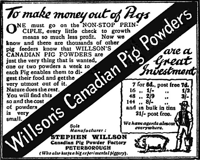 An advertising card issued by Peterborough’s Stephen Willson who was the sole trader of his Canadian Pig Powders that promised to “cure ills, prevent disease and make pigs more profitable” !